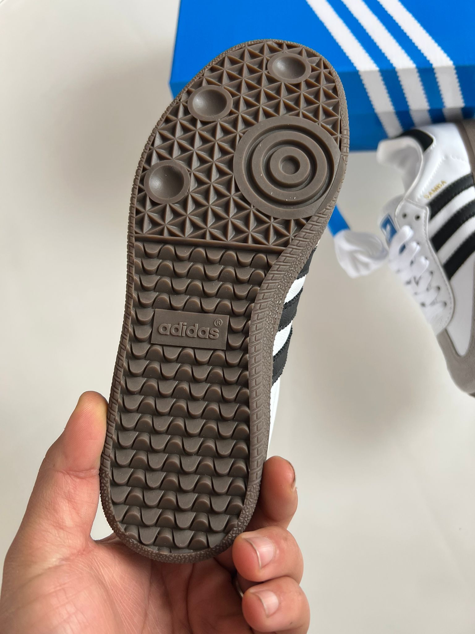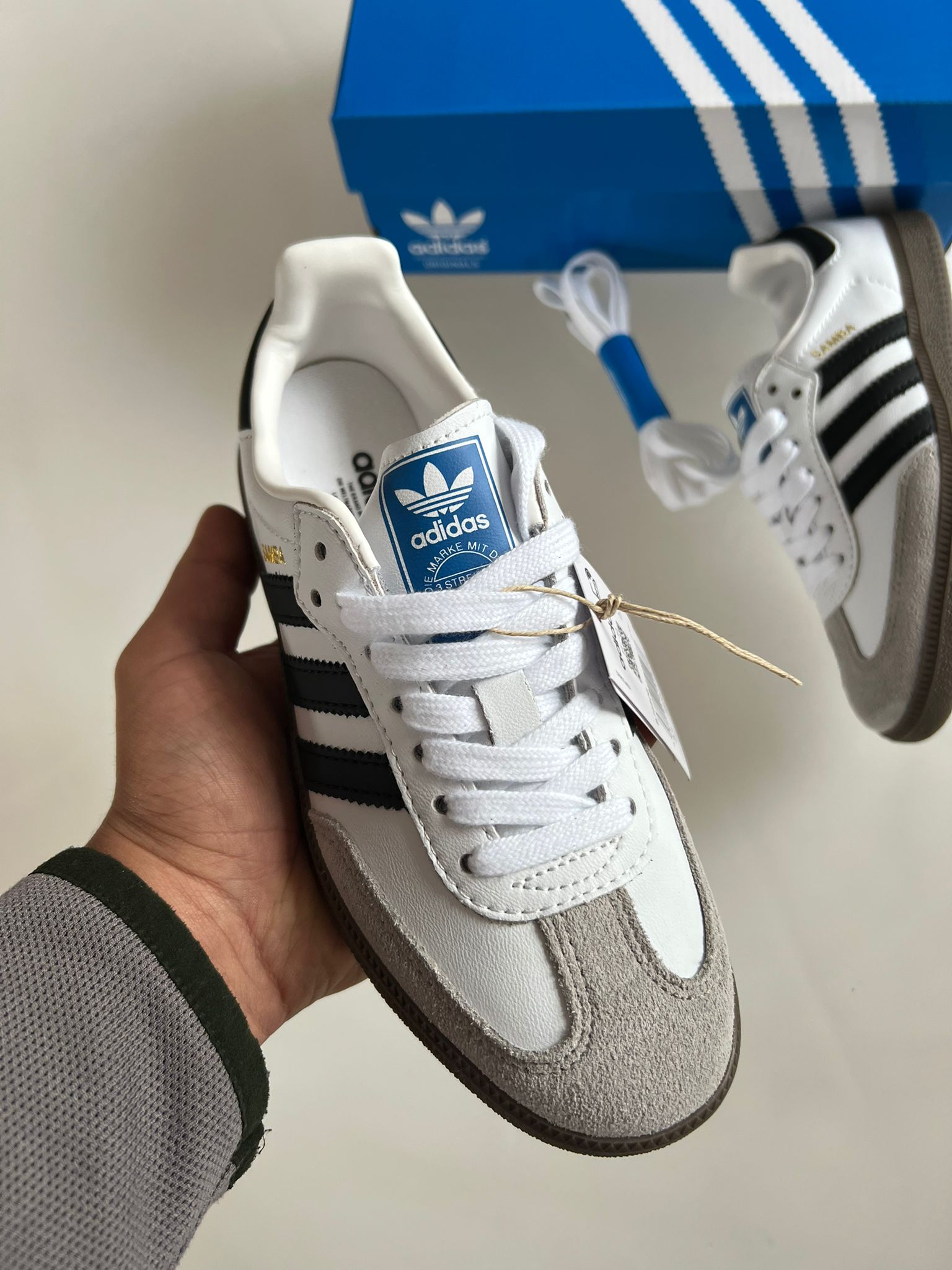 Adidas samba blancas y negras logo dorado