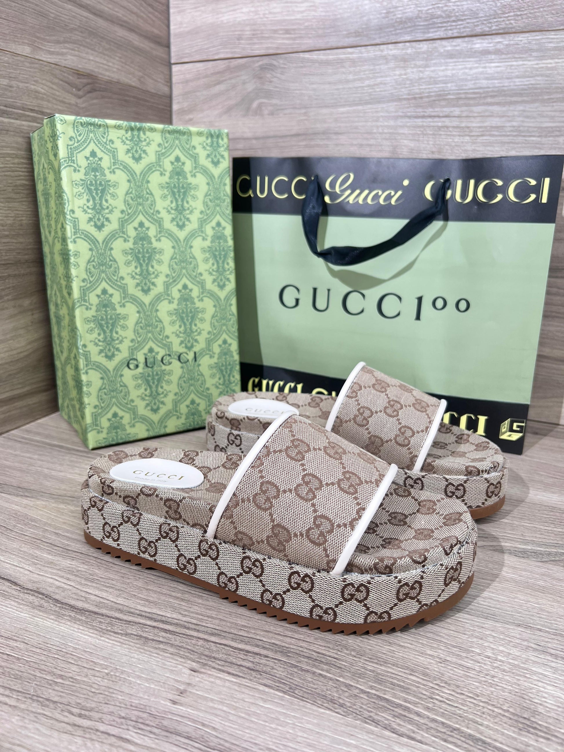 Chancla Gucci mujer terciopelo marron logo marron detalles blanco