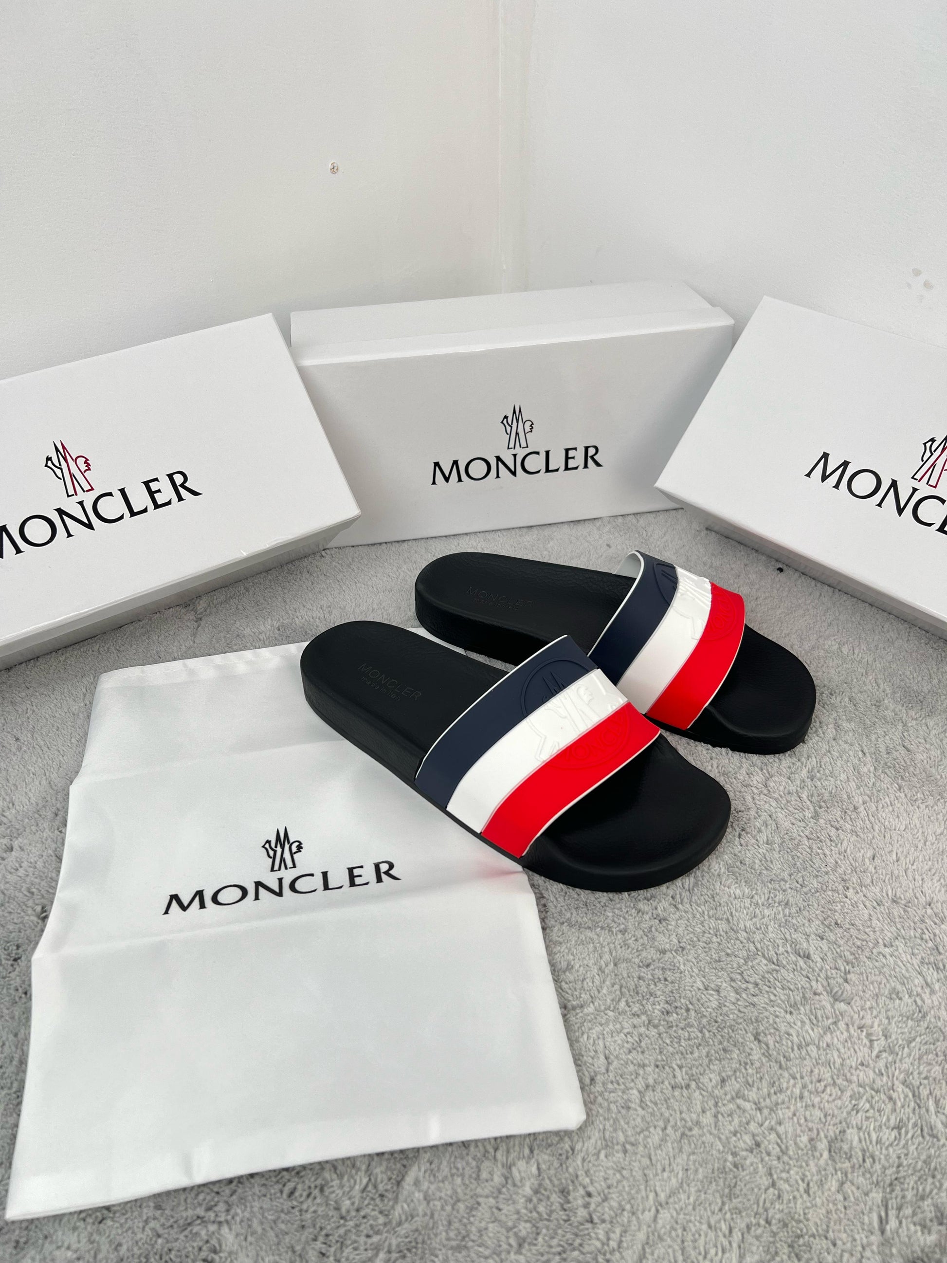 Chancla Moncler negra logo tricolor
